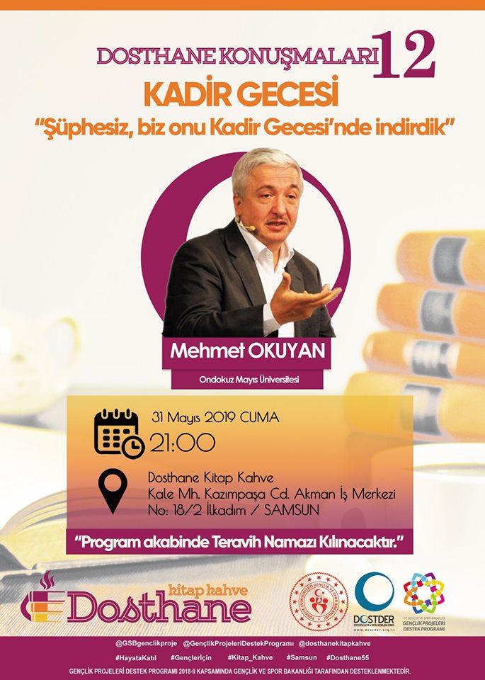 Kadir Gecesi ekseninde, “ilk vahiy” ve “Kur’an-ı Kerim’de Kadir Gecesi” konularının konuşulacağı program, Ondokuz Mayıs Üniversitesi İlahiyat Fakültesi hocalarından Prof. Dr. Mehmet Okuyan hocamızın sunumuyla, 31 Mayıs 2019 Cuma akşamı saat 21.00’de Dosthane Kitap Kahve'de gerçekleşecek.
