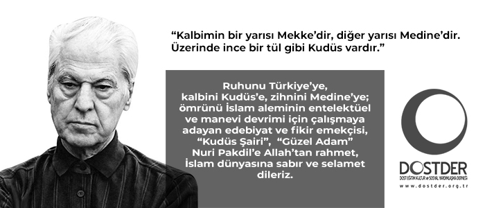 Ruhunu Türkiye’ye, kalbini Kudüs’e, zihnini Medine’ye; ömrünü İslam aleminin entelektüel ve manevi devrimi için çalışmaya adayan edebiyat ve fikir emekçisi, “Kudüs Şairi”, “Güzel Adam” Nuri Pakdil’e Allah’tan rahmet, İslam dünyasına sabır ve selamet dileriz.