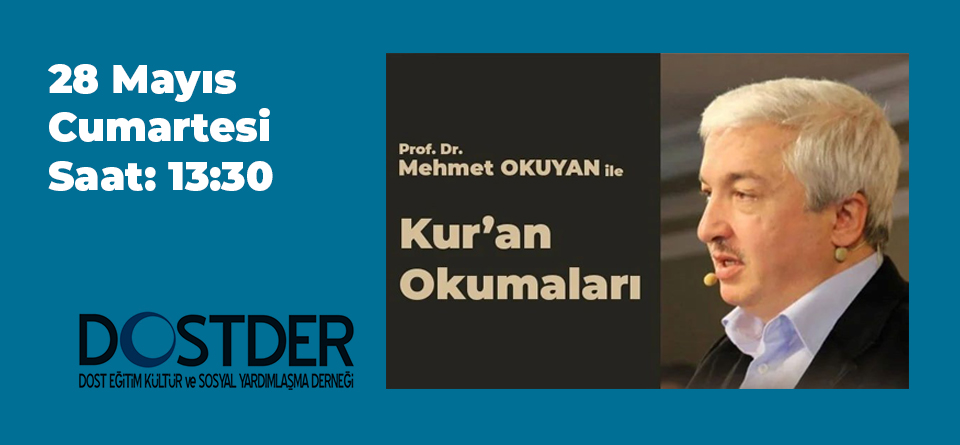 Prof. Dr. Mehmet Okuyan ile Kur'an Okumaları;28 Mayıs Cumartesi günü saat 13.30 da "Muhammed Sûresi"nin tefsiri ile DOSTDER Aliya İzzetbegoviç Konferans Salonunda devam edecektir.