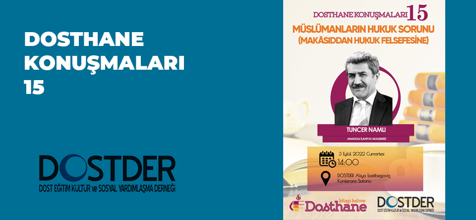 DOSTDER, Dosthane Konuşmaları’nın on beşinci programını “Müslümanların Hukuk Sorunu (Makāsıddan Hukuk Felsefesine)” başlığıyla hukuk düşüncesinin gelişim ve anlaşılması konusuna ayırıyor.