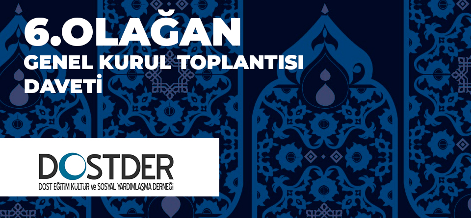 Sayın Gönüllülerimiz; Derneğimizin 6.Olağan Genel Kurul Toplantısı 1 Ocak 2023 Pazar günü saat 14.00 da DOSTDER Aliya İzzetbegoviç Konferans Salonunda yapılacaktır. Öneri ve görüşlerinizi sunabileceğiniz Genel Kurul Toplantımıza teşriflerinizi bekler, saygılar sunarız.