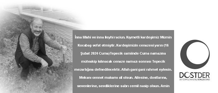 İnna lillahi ve inna ileyhi raciun. Kıymetli kardeşimiz Mümin Kocabaş vefat etmiştir. Kardeşimizin cenazesi yarın (16 Şubat 2024 Cuma)Tepecik camiinde Cuma namazına müteakip kılınacak cenaze namazı sonrası Tepecik mezarlığına defnedilecektir. Allah gani gani rahmet eylesin. Mekanı cennet makamı alî olsun. Ailesine, dostlarına, sevenlerine, sevdiklerine sabrı cemil nasip olsun. Amin